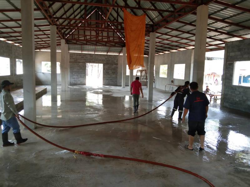เจ้าหน้าที่ฝ่ายป้องกัน ฉีดน้ำล้างพื้นที่ศาลาวัดบ้านวังขอนกว้าง