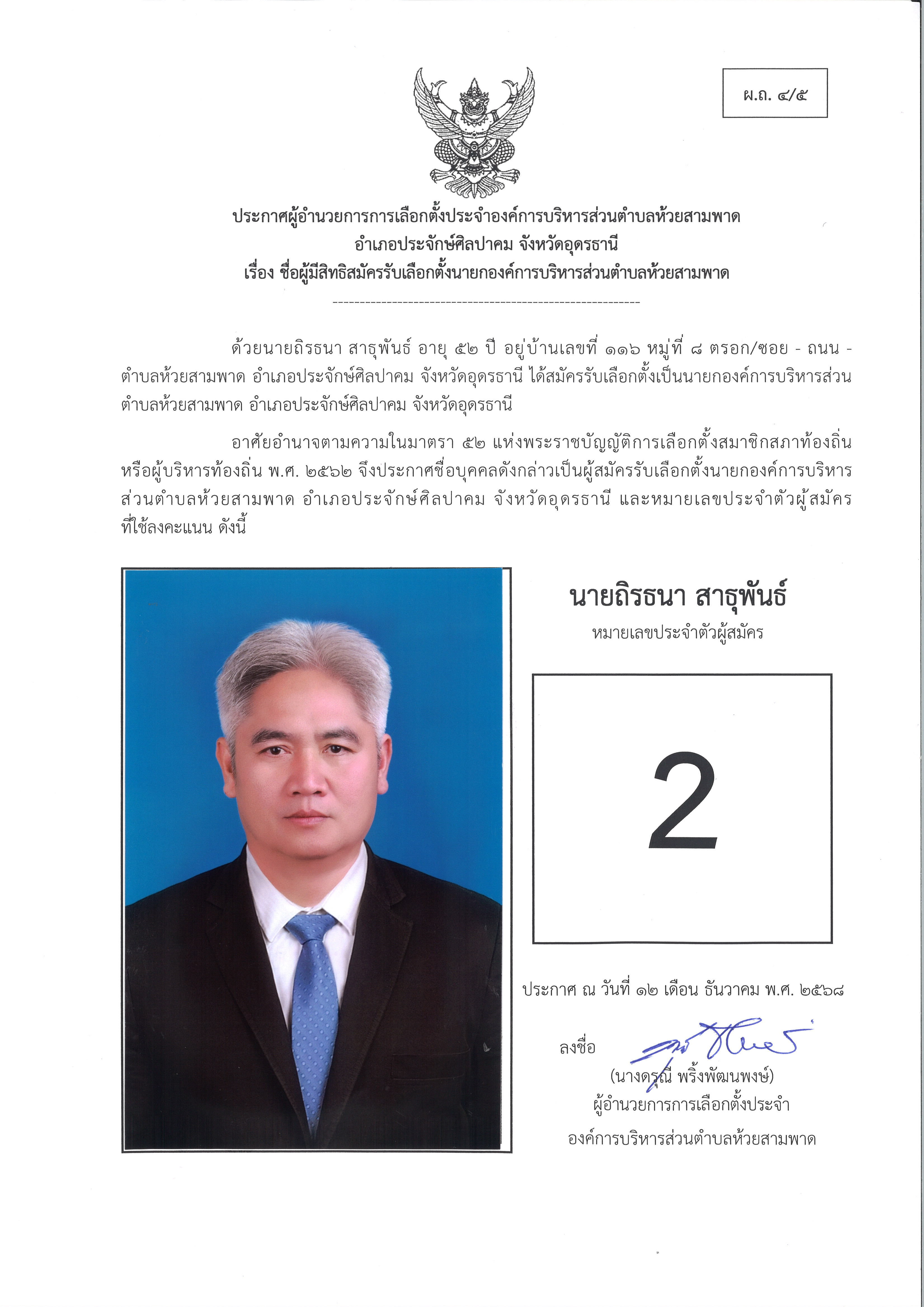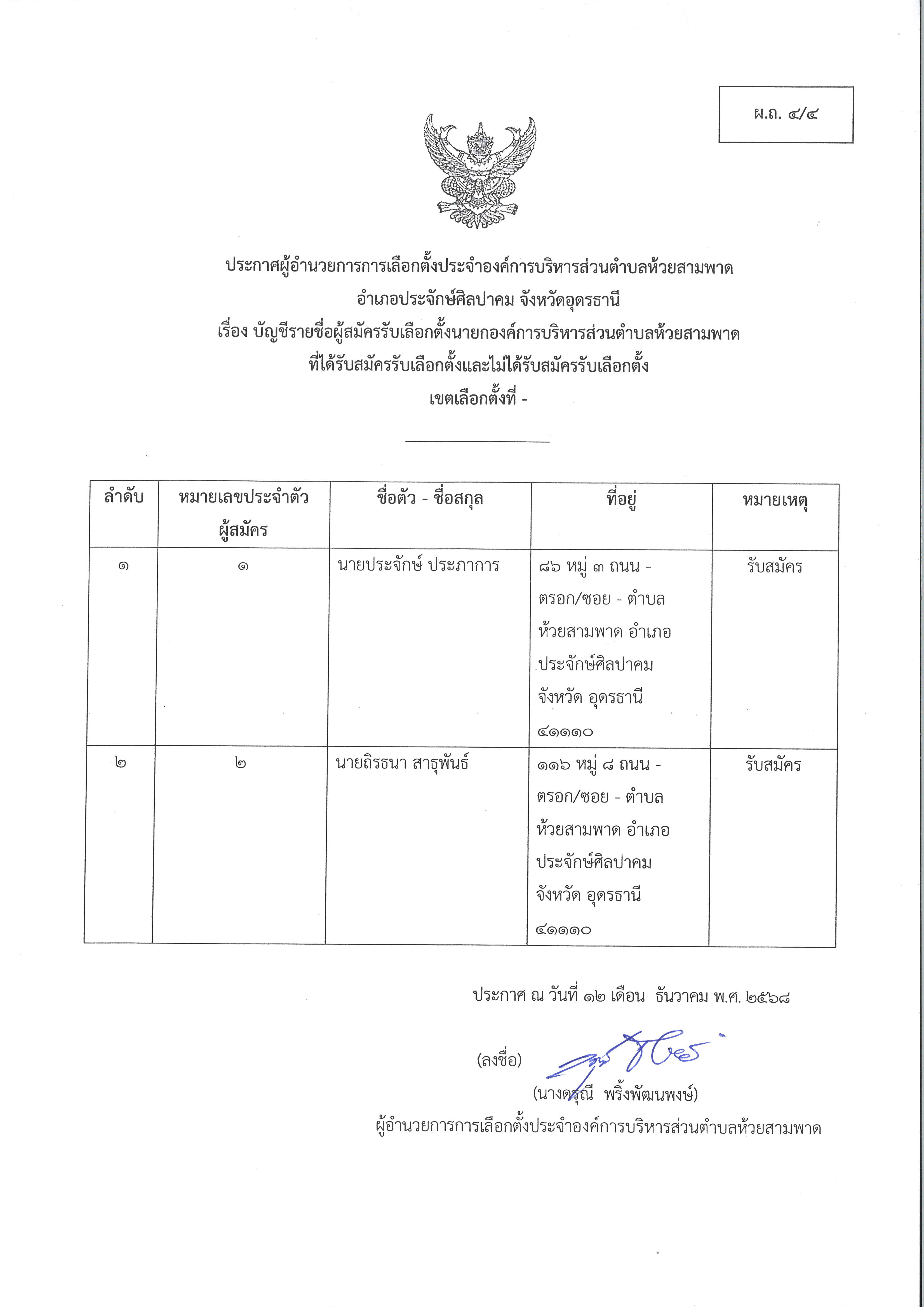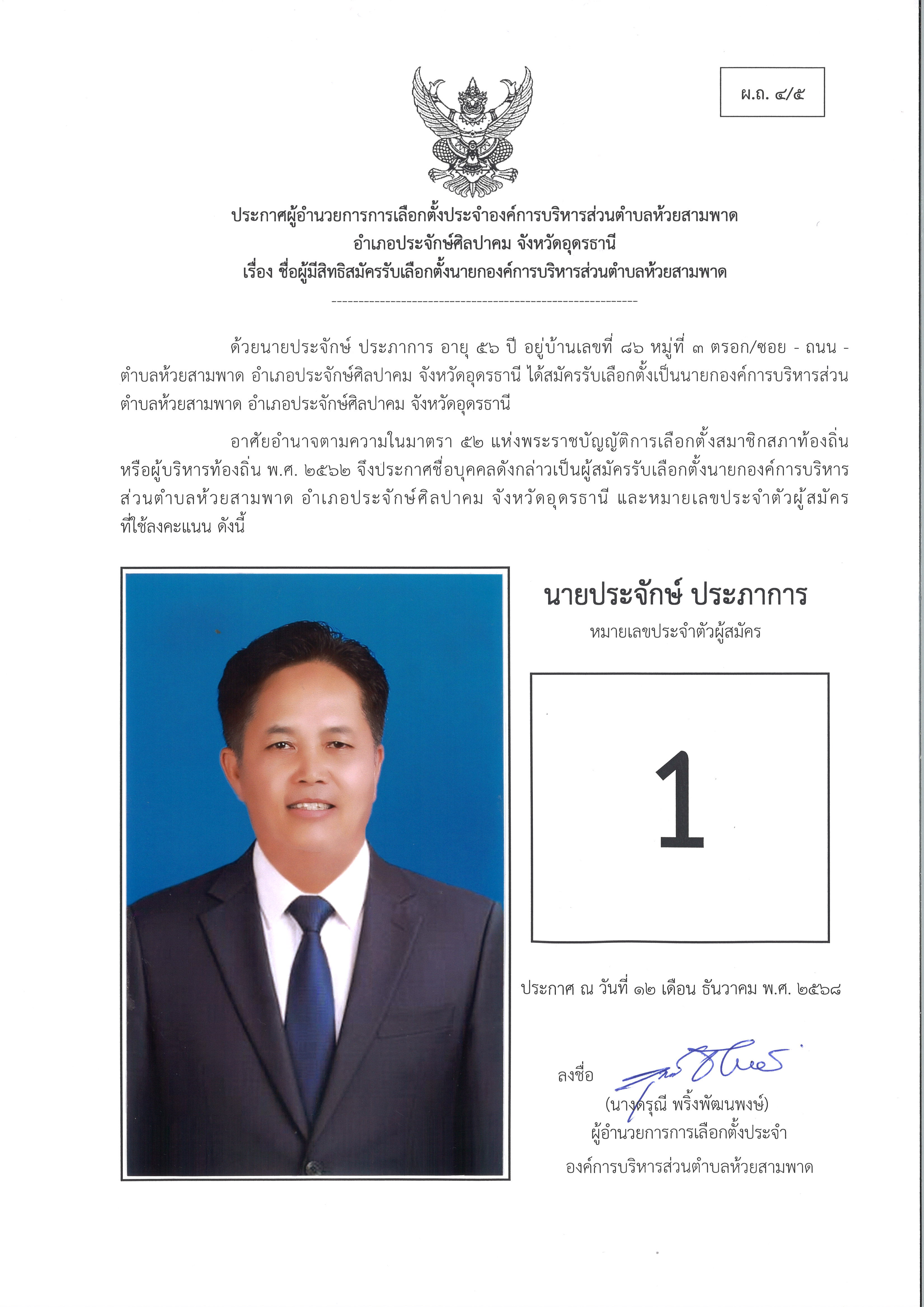 ประกาศผู้อำนวยการการเลือกตั้งองค์การบริหารส่วนตำบลห้วยสามพาด เรื่อง บัญชีรายชื่อผู้สมัครรับเลือกตั้งนายกองค์การบริหารส่วนตำบลห้วยสามพาด